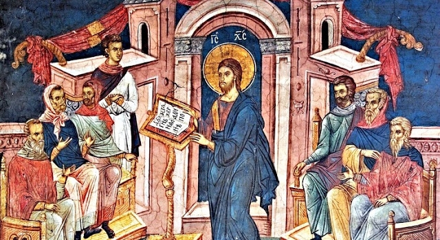 - Jesús llegó a Nazaret, y según su costumbre de buen judío, entró el día sábado en la sinagoga y se levantó para hacer la lectura; al terminar de leer, enrolló el libro y se lo devolvió al ayudante; y a continuación dijo la homilía. La fama de Jesús había crecido y esperaban su palabra con impaciencia.