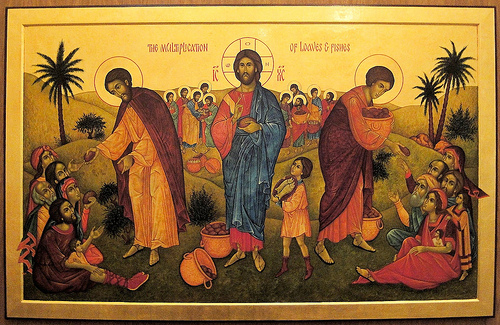 - La mirada se centra en Jesús. Los discípulos están ante el pueblo con las manos vacías, se reconocen incapaces de remediar la necesidad. No pueden hacer nada si no interviene el Señor. Jesús toma la iniciativa: va a utilizar la totalidad del alimento de que dispone el grupo. Dios quiere seguir alimentando a los demás por medio de las pobres provisiones de los hombres.
