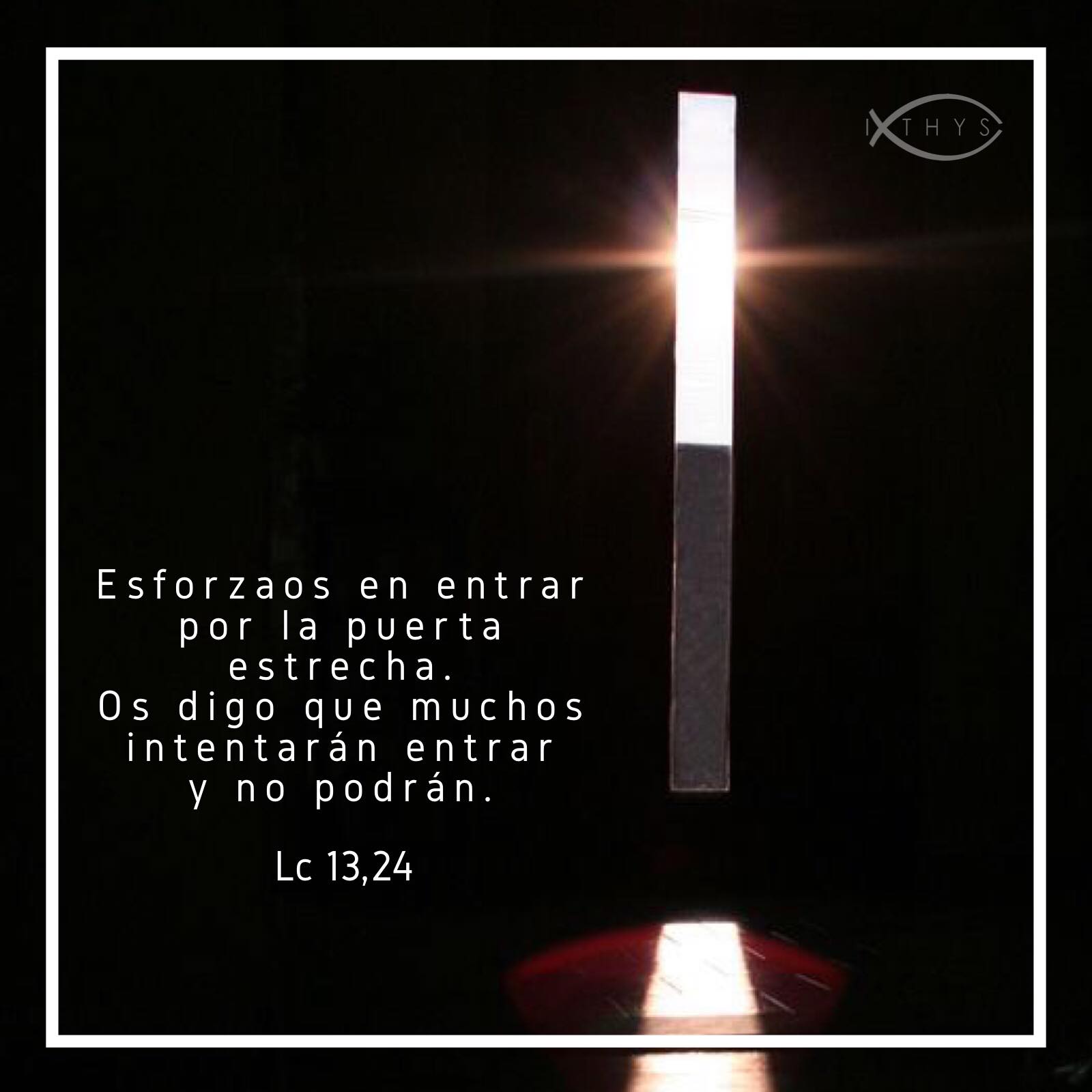 Jesús les dijo: «Esforzaos en entrar por la puerta estrecha. Os digo que muchos intentarán entrar y no podrán. Cuando el amo de la casa se levante y cierre la puerta, os quedaréis fuera y llamaréis a la puerta, diciendo: «Señor, ábrenos»; y él os replicará: «No sé quiénes sois.» Entonces comenzaréis a decir: «Hemos comido y bebido contigo, y tú has enseñado en nuestras plazas.» Pero él os replicará: «No sé quiénes sois. Alejaos de mí, malvados.» Entonces será el llanto y el rechinar de dientes, cuando veáis a Abrahán, Isaac y Jacob y a todos los profetas en el reino de Dios, y vosotros os veáis echados fuera. Y vendrán de oriente y occidente, del norte y del sur, y se sentarán a la mesa en el reino de Dios. Mirad: hay últimos que serán primeros, y primeros que serán últimos.»