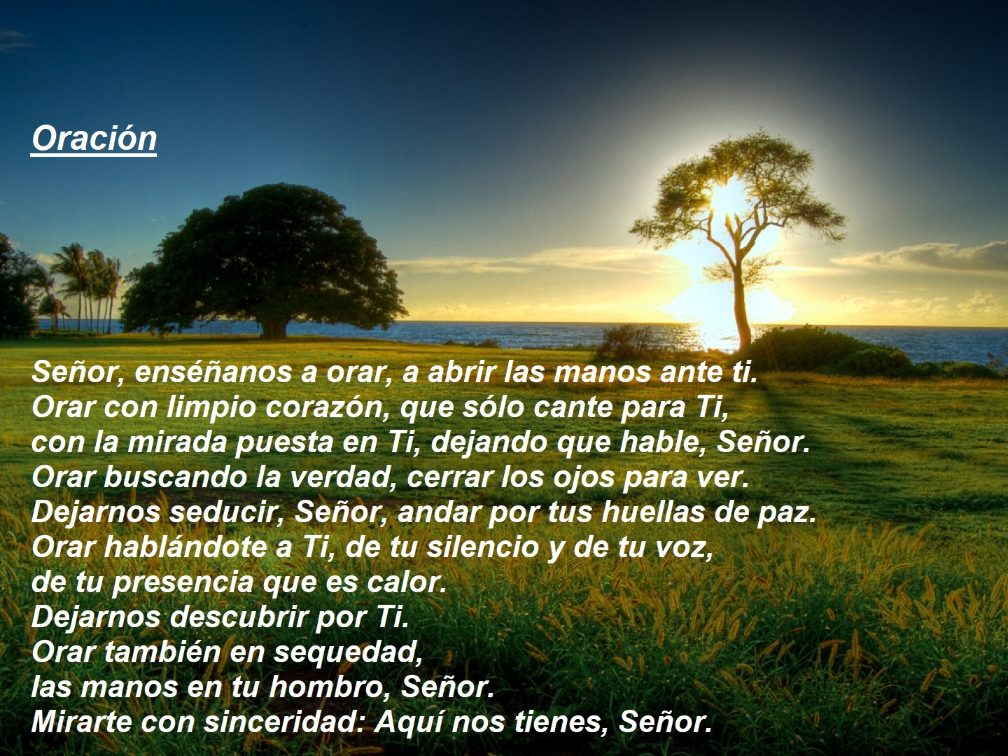 - Jesús aparece orando «en cierto lugar». Jesús ora porque necesita ir a la raíz de su experiencia filial, porque necesita respirar el cariño de su Abbá. Y, desde esa raíz se encuentra con todo y con todos. Su acción despierta un deseo en los discípulos: «Señor, enséñanos a orar». Querían una fórmula. Jesús en cambio les ofrece la oportunidad de un diálogo, un lugar, una identidad, un estilo de vida. Querían aprender unas formas como las que Juan enseñó a sus discípulos. Jesús les presenta e inaugura una forma de orar inaudita.